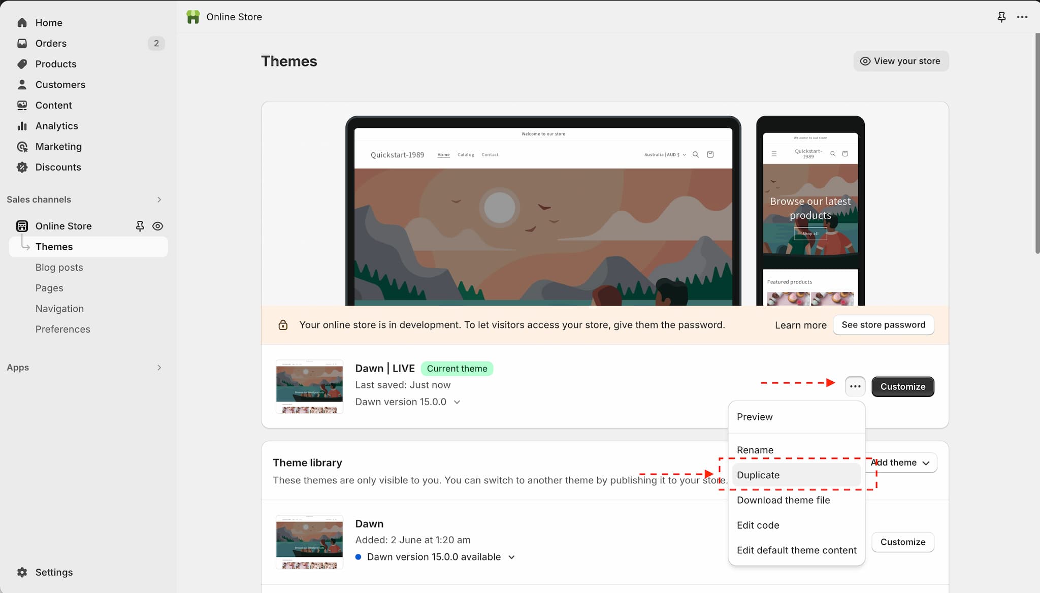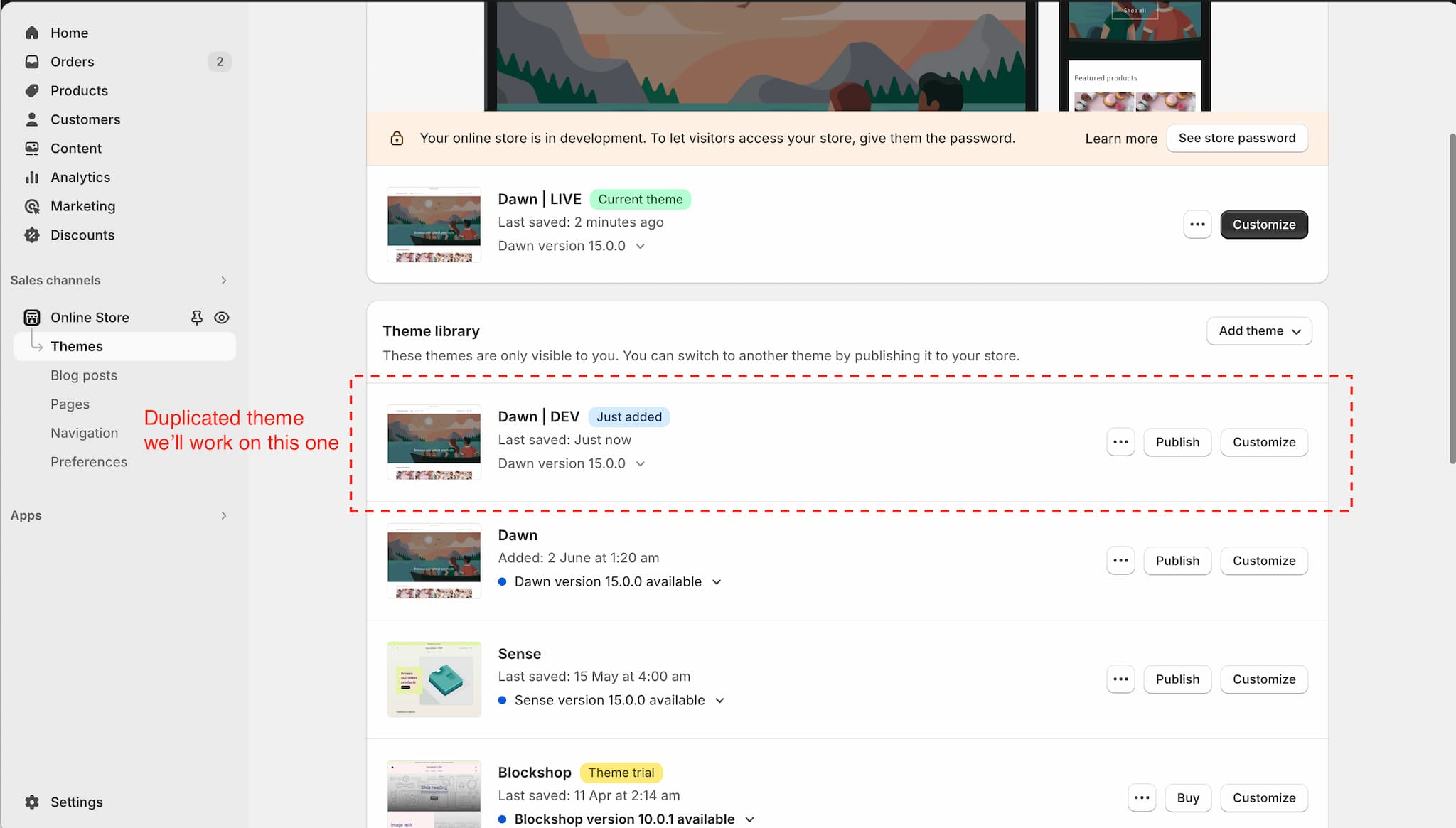 Click Duplicate to create a duplicate version of your live theme that we will work on safely