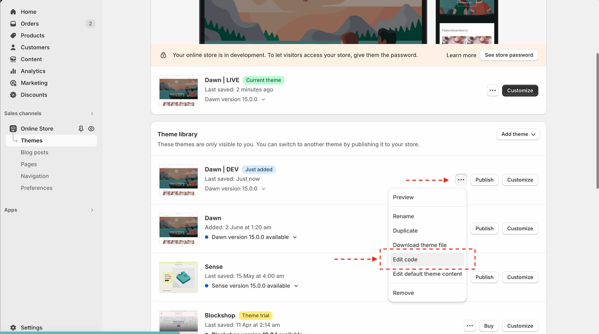 Click Edit code to be taken to the area where we will directly editor your code files for that version of the theme.