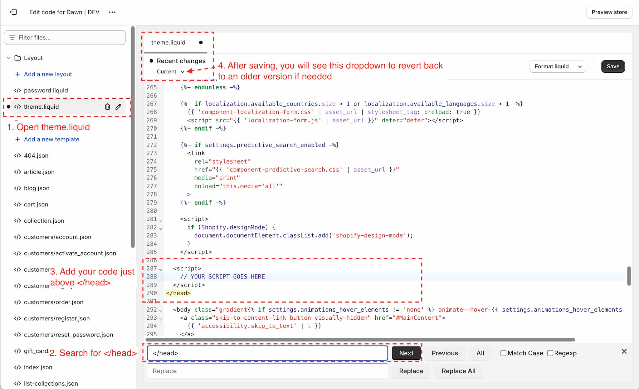 - In your theme.liquid file, hit CMD + F (Mac) or CTRL + F (Windows) to open up a search bar
