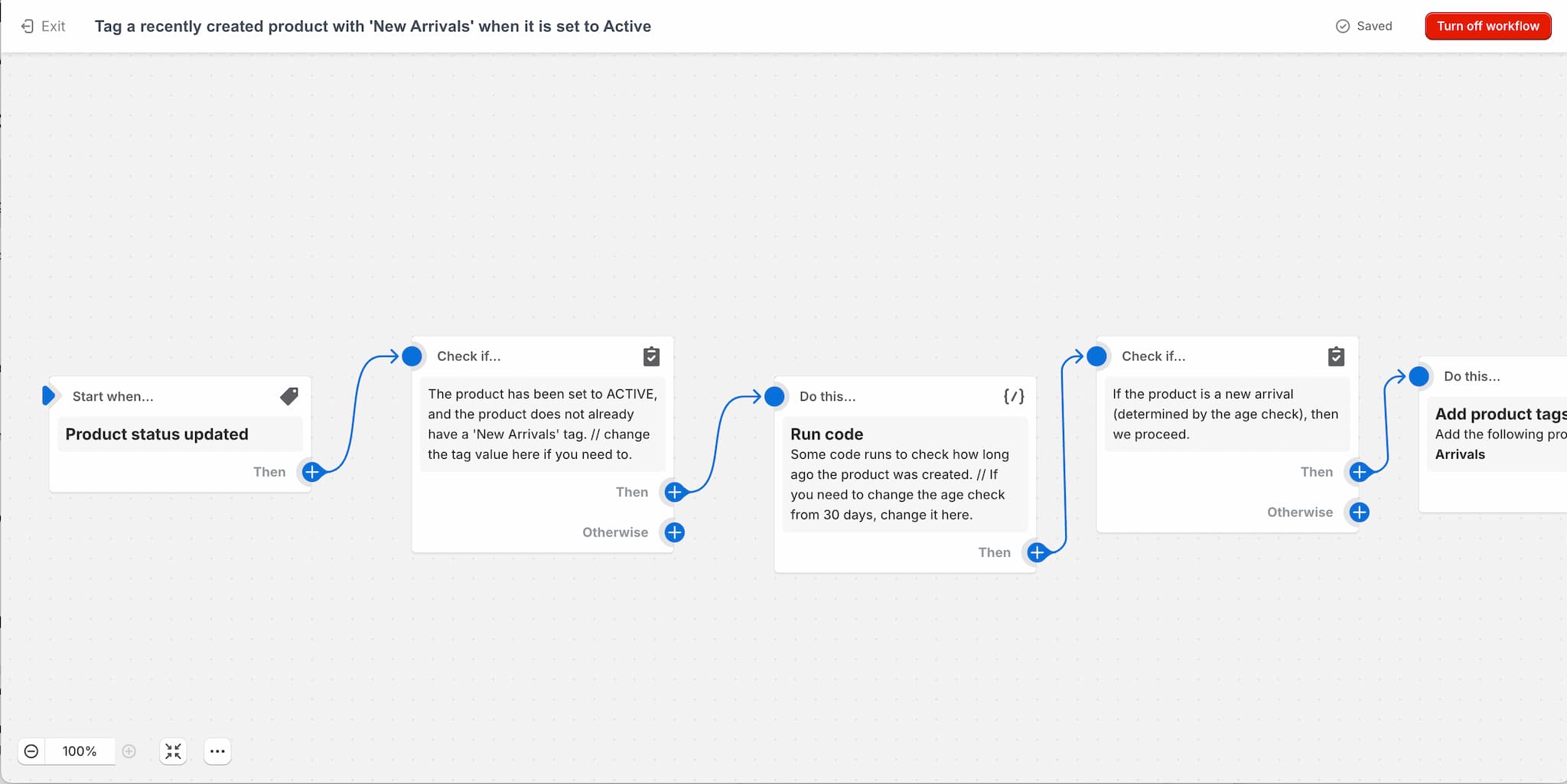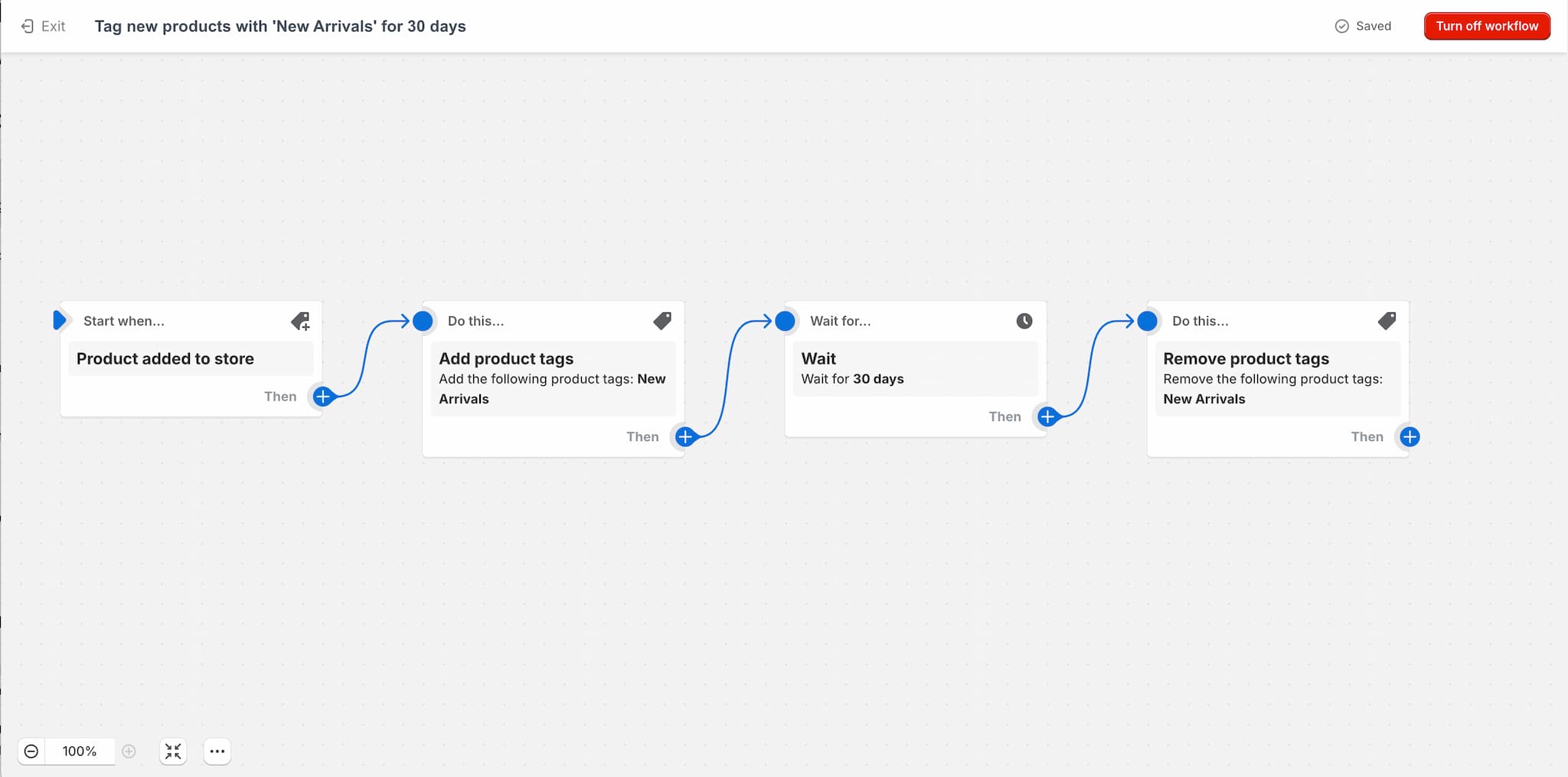 Shopify Flow will then automatically add and remove the New Arrivals tag on new products for 30 days.